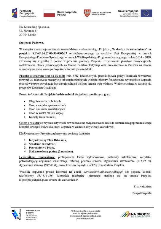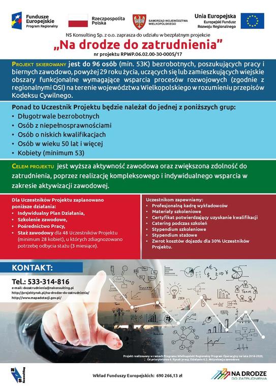 Wszelkie zapytania proszę kierować na email: dozatrudnienia@nskonsulting.pl lub poprzez kontakt telefoniczny 533-314-816. Wszystkie niezbędne informacje znajdują się na stronie Projektu https://projektynsk.pl/na-drodze-do-zatrudnienia/.