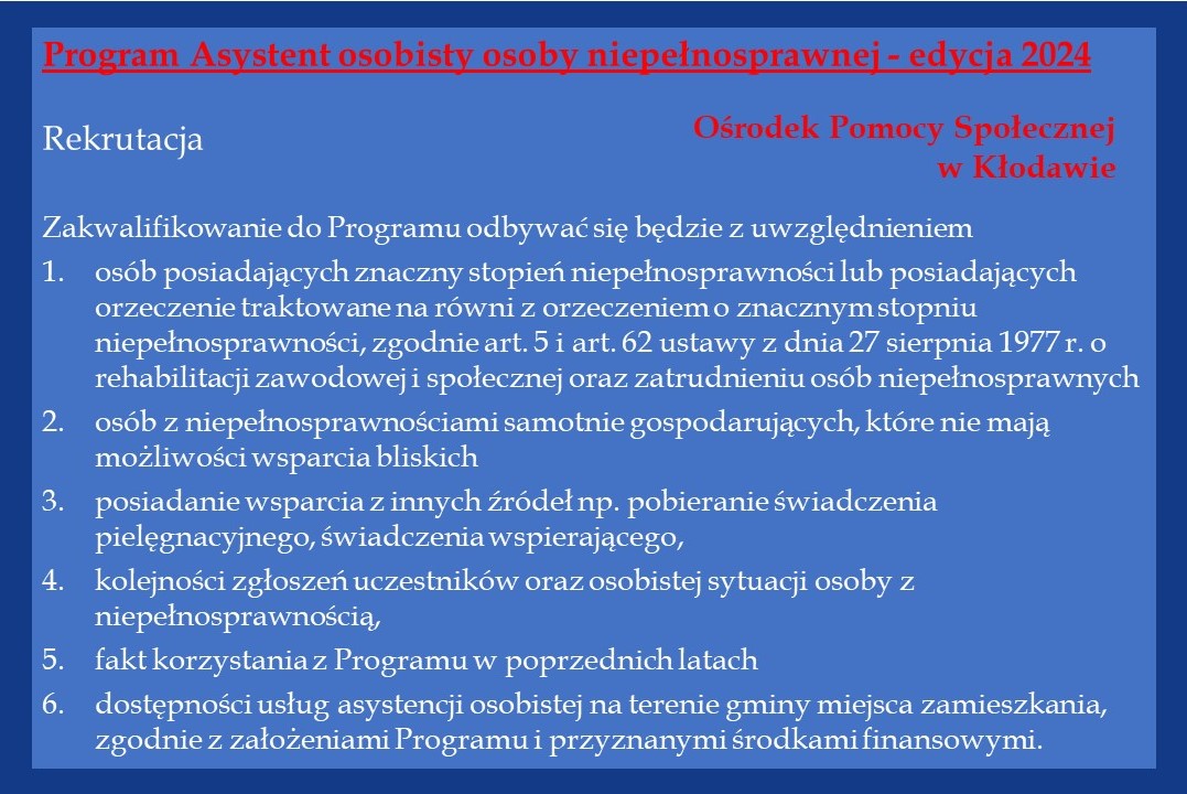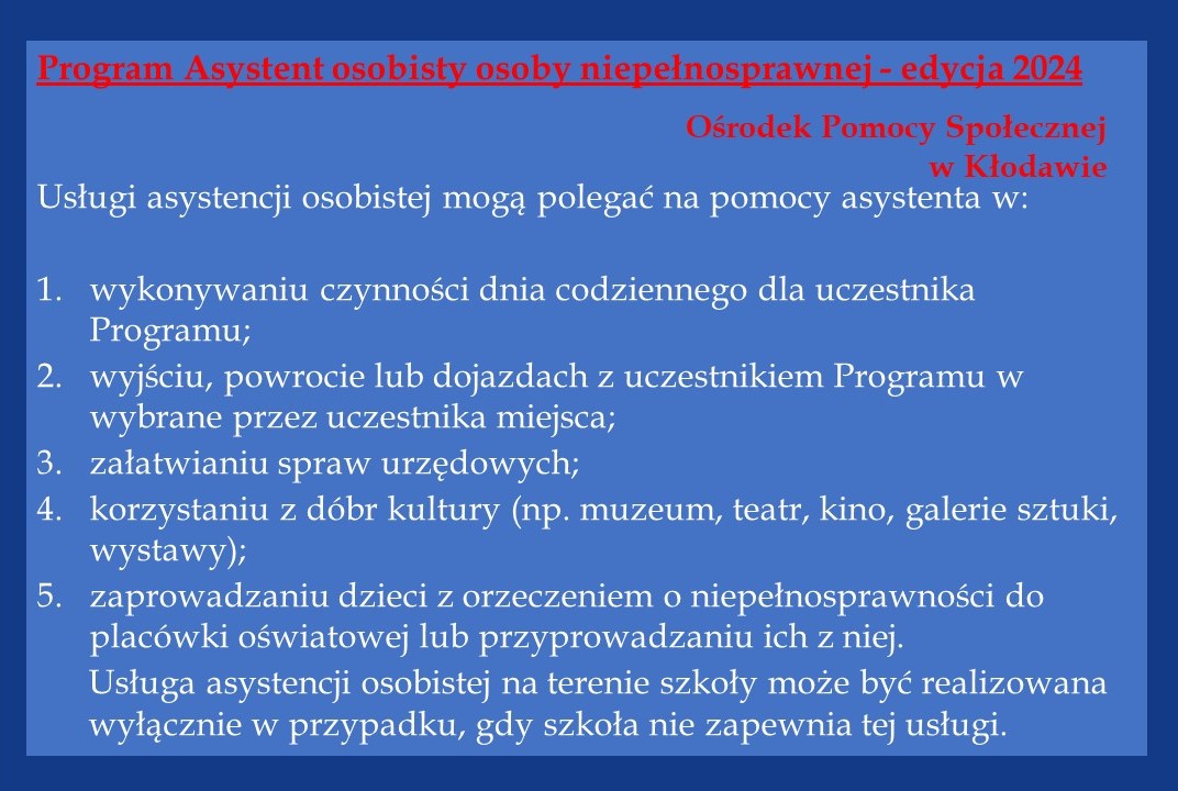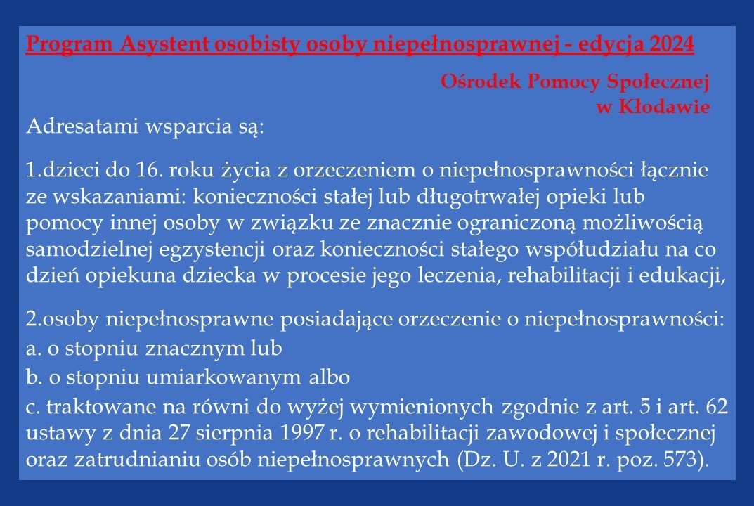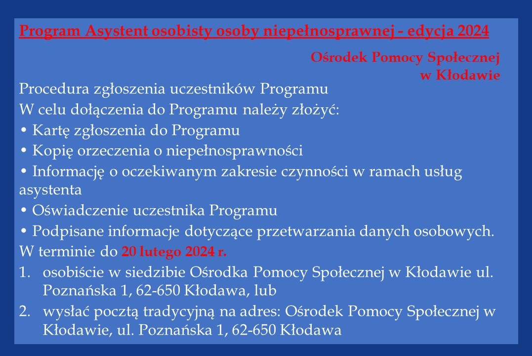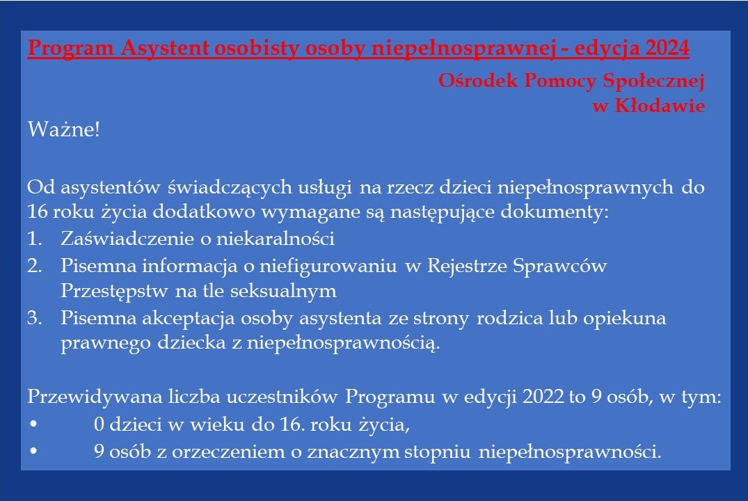 Ośrodek Pomocy Społecznej w Kłodawie ogłasza nabór wniosków do realizacji Programu „Asystent Osobisty Osoby Niepełnosprawnej” – edycja 2024 finansowanego ze środków Funduszu Solidarnościowego.
