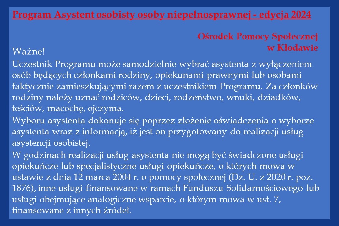 Ważne! Uczestnik Programu może samodzielnie wybrać asystenta z wyłączeniem osób będących członkami rodziny, opiekunami prawnymi lub osobami faktycznie zamieszkującymi razem z uczestnikiem Programu. Za członków rodziny należy uznać rodziców, dzieci, rodzeństwo, wnuki, dziadków, teściów, macochę, ojczyma.